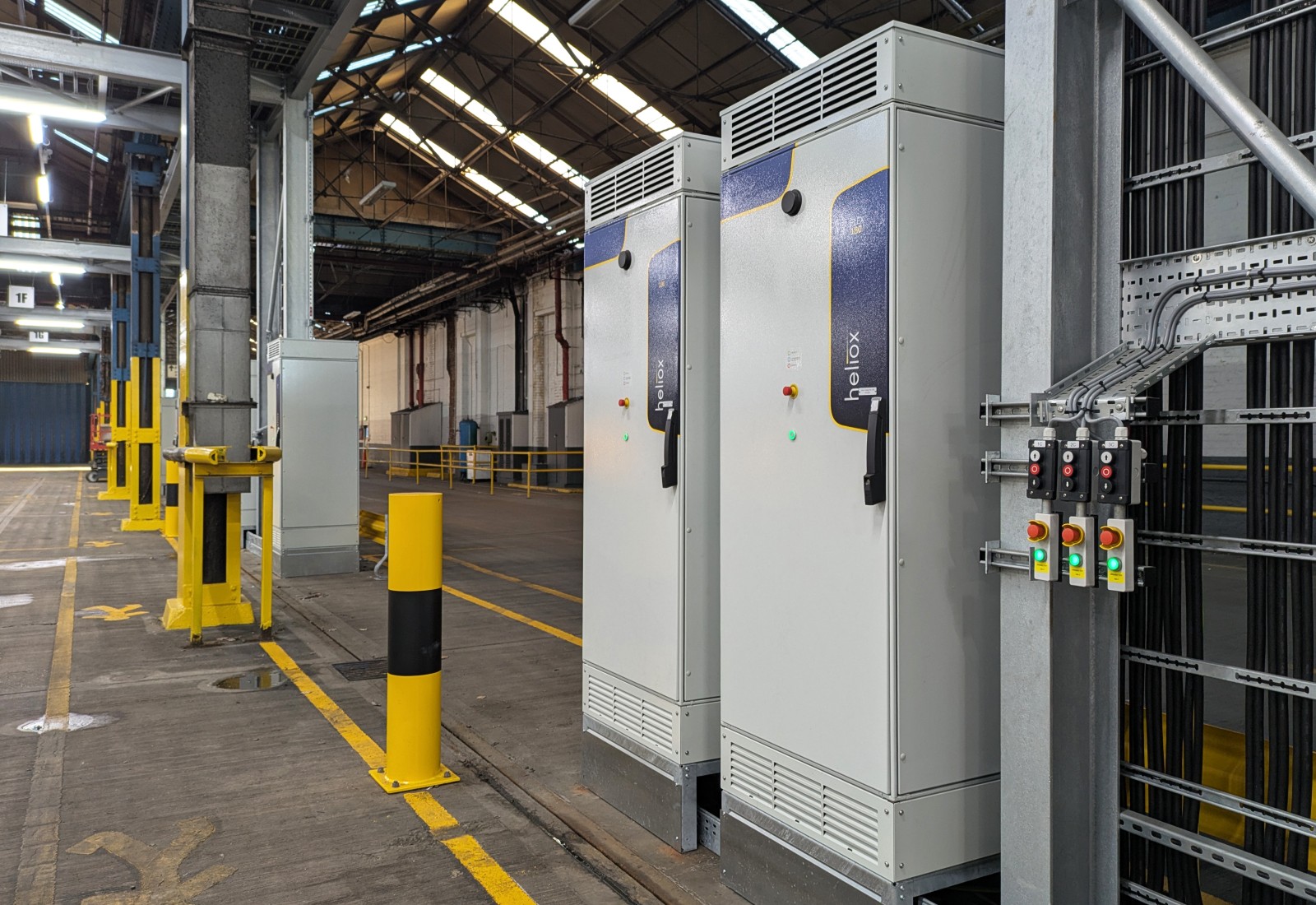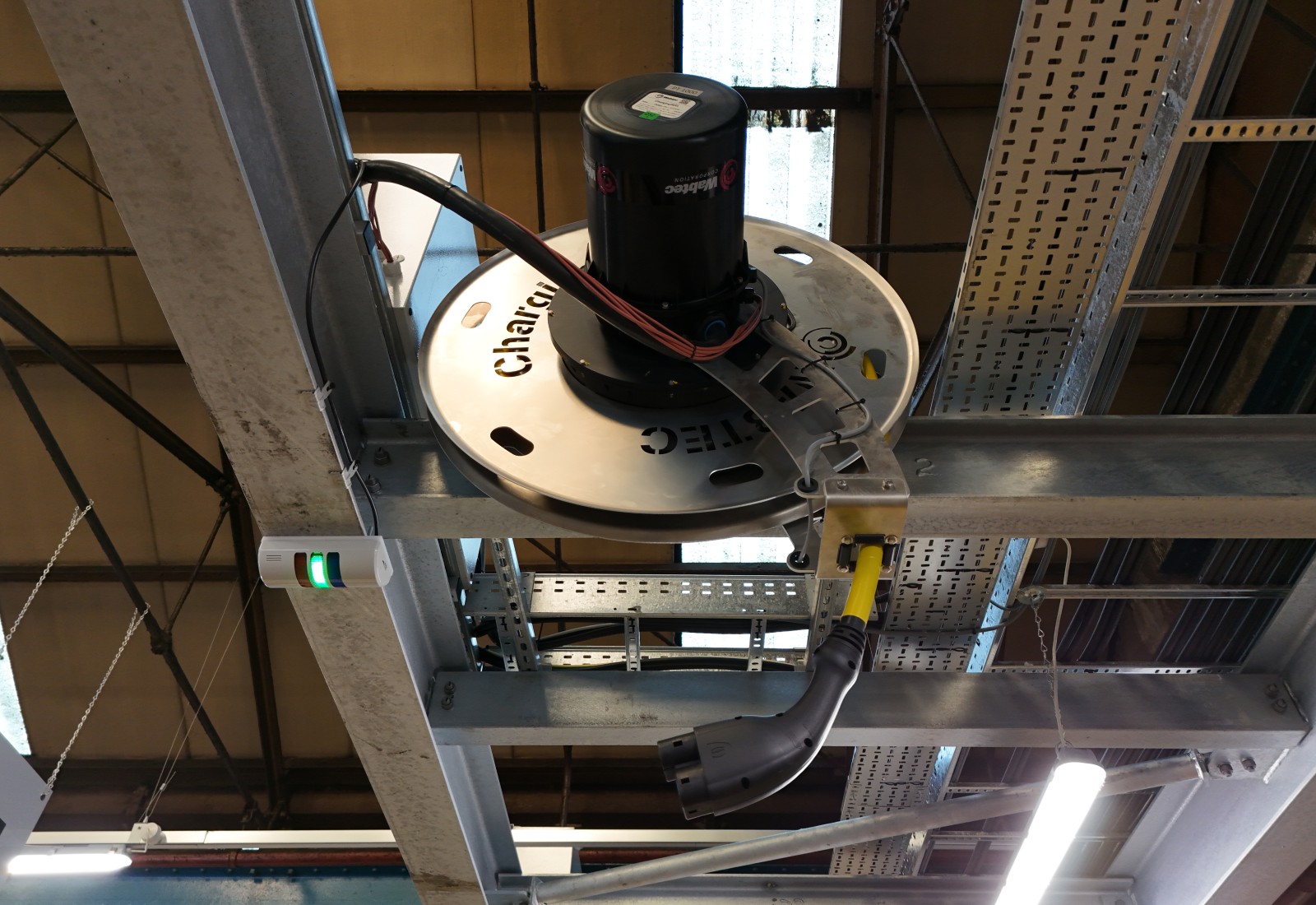The innovative gantry installation utilises Heliox Flex 180 chargers at ground level, feeding electrically operated reels suspended above each bus at high level. The reels provide remote lowering of power leads adjacent to the charging port of each bus, reducing trailing cables and intermediate islands. The chargers are in located the “dead” spatial zones in line with the existing building columns.